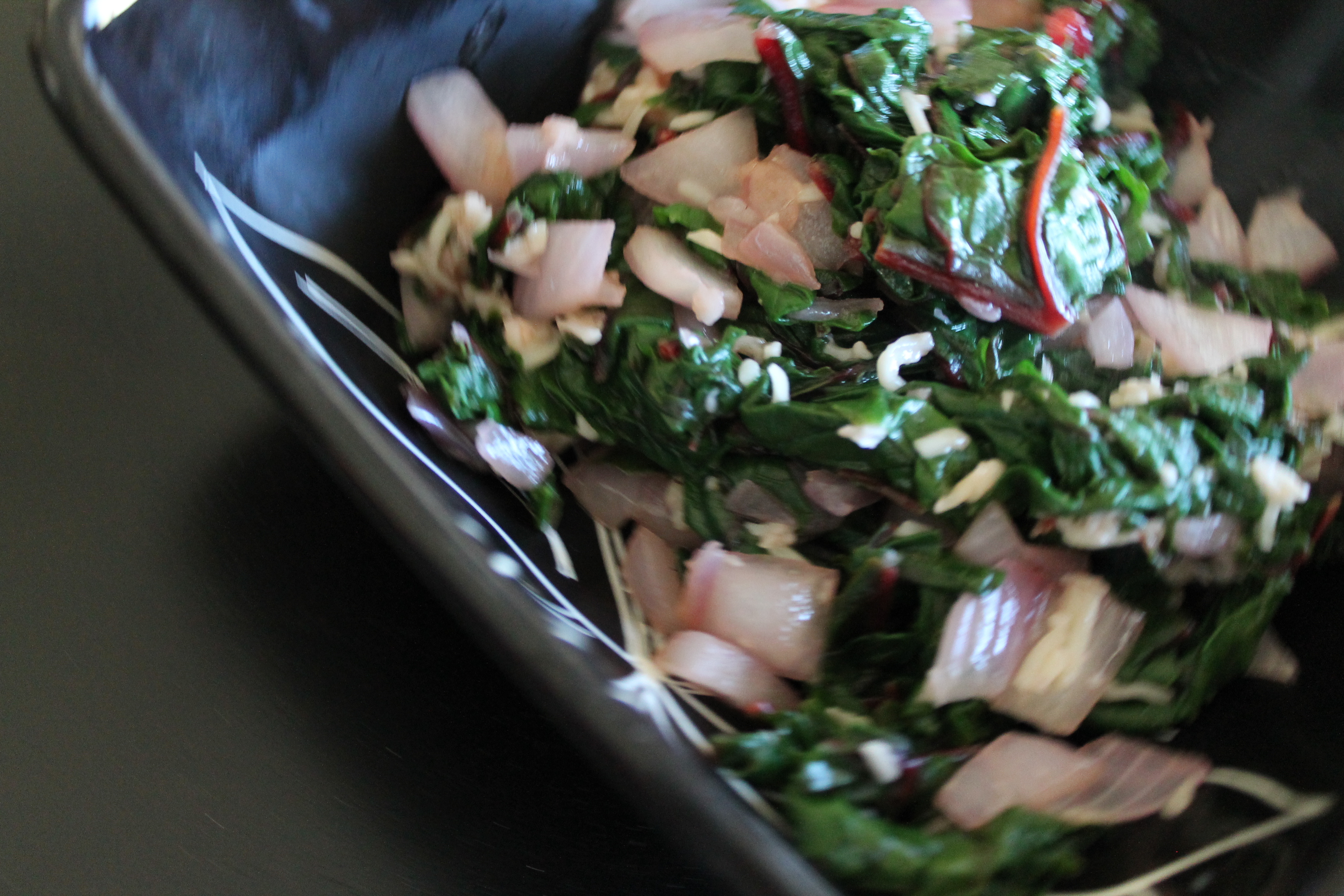 Heat olive oil in a skillet over medium-high heat. Cook the onion for about a minute until it’s translucent. Add the garlic and cook for 30 more seconds. Add the boiled swiss chard and sauté everything for a minute.